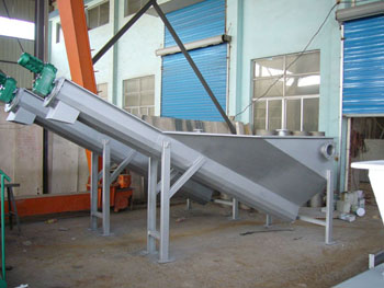 砂水混合物從頂部的法蘭接管進(jìn)入儲液箱內(nèi)。箱內(nèi)專門設(shè)計的散水盤使水匯集于下水槽。砂水混合夜中,砂石逐漸沉淀于下部的螺旋u形槽內(nèi)?招膸铰菪徛D(zhuǎn)砂礫推向上出口,自然脫水排除。